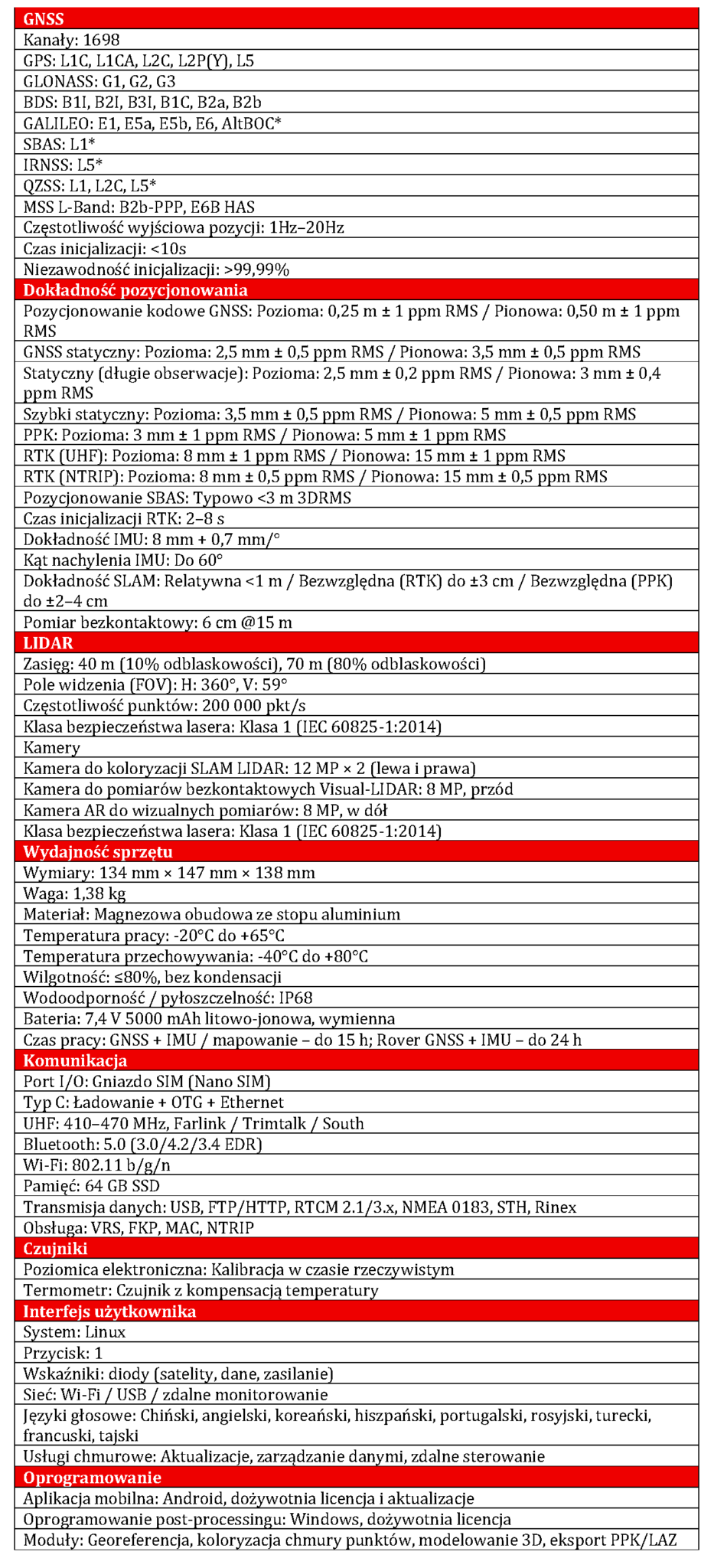 - Hybryda technologii: Łączy zalety SLAM (pomiar w trudnych warunkach) i RTK (wysoka precyzja), zapewniając wszechstronność i niezawodność.